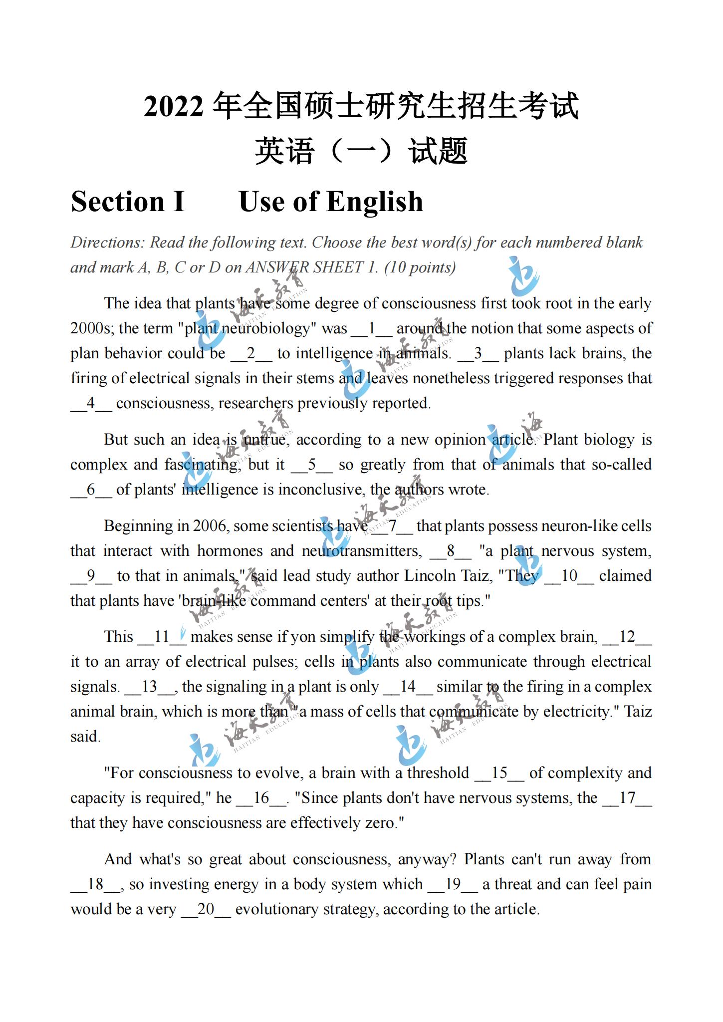 2022考研英语一真题原文完整版